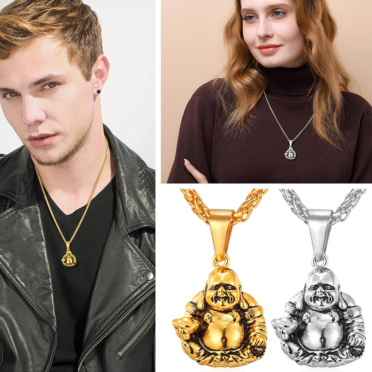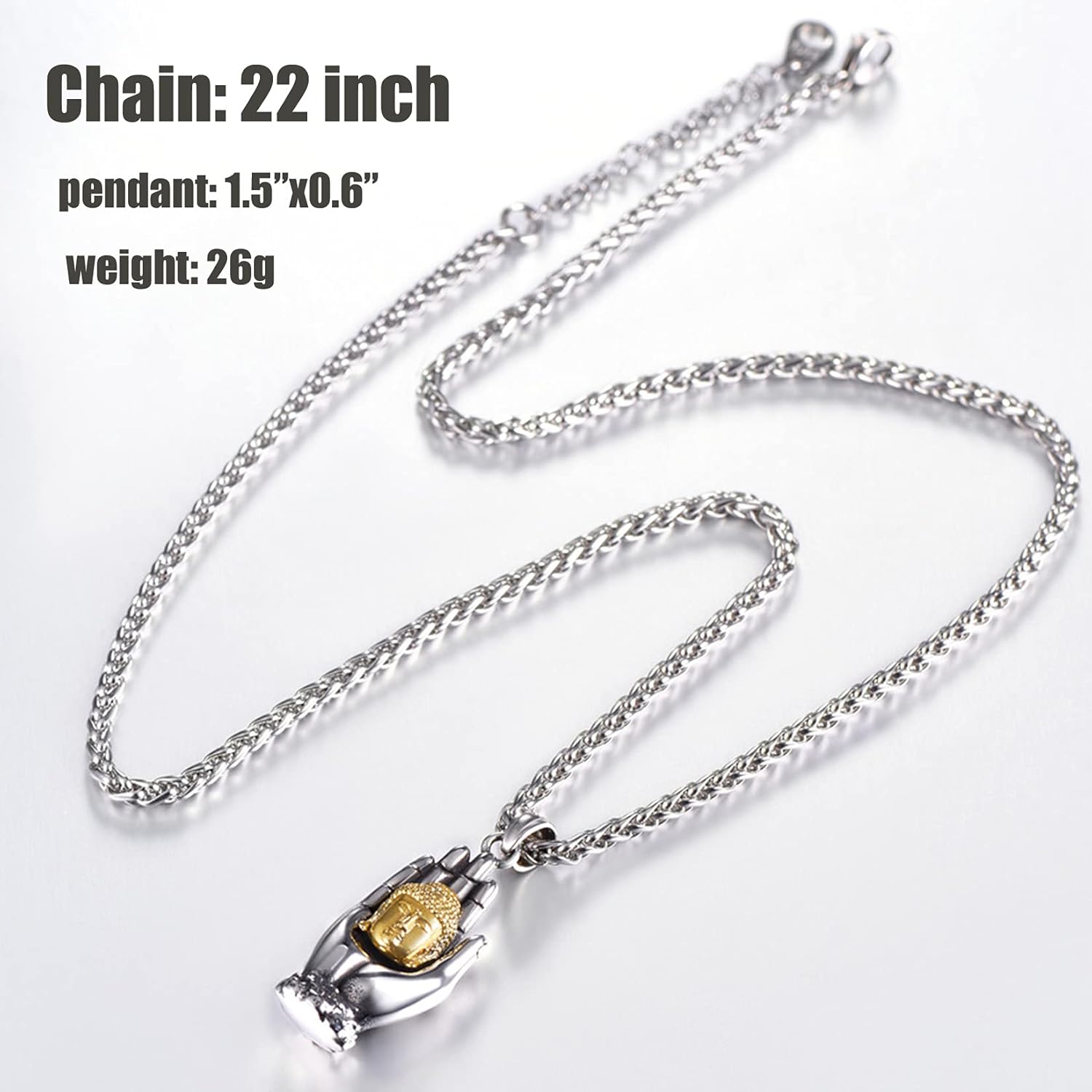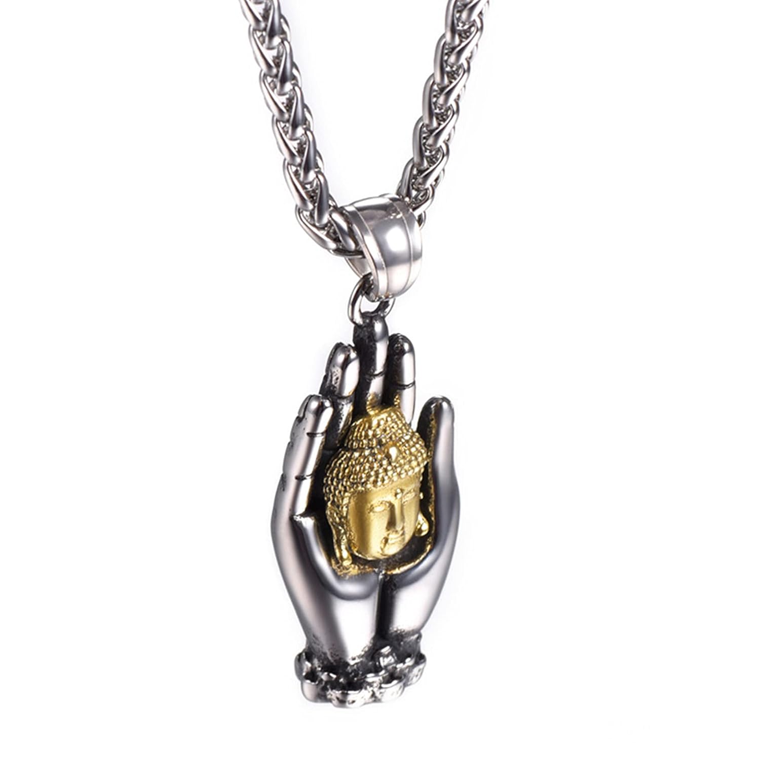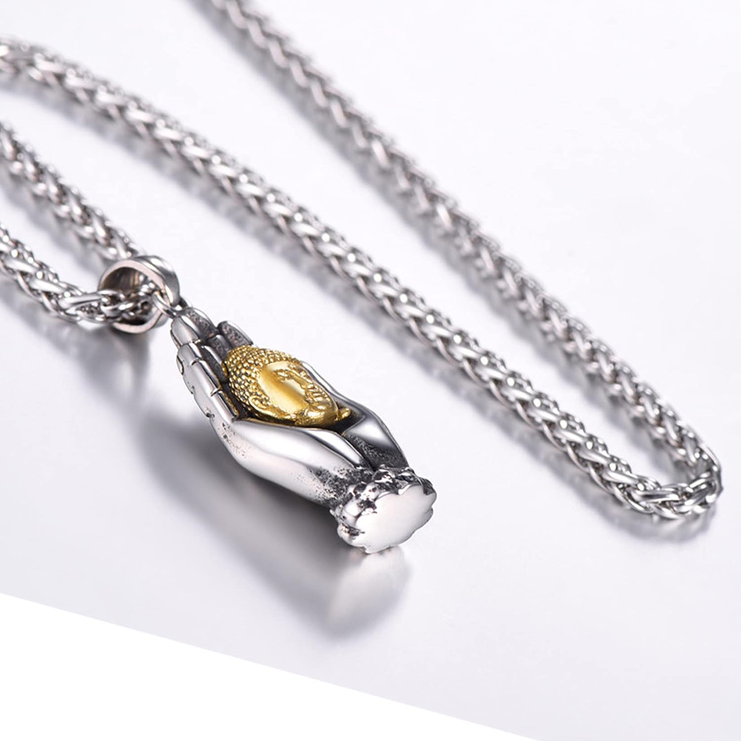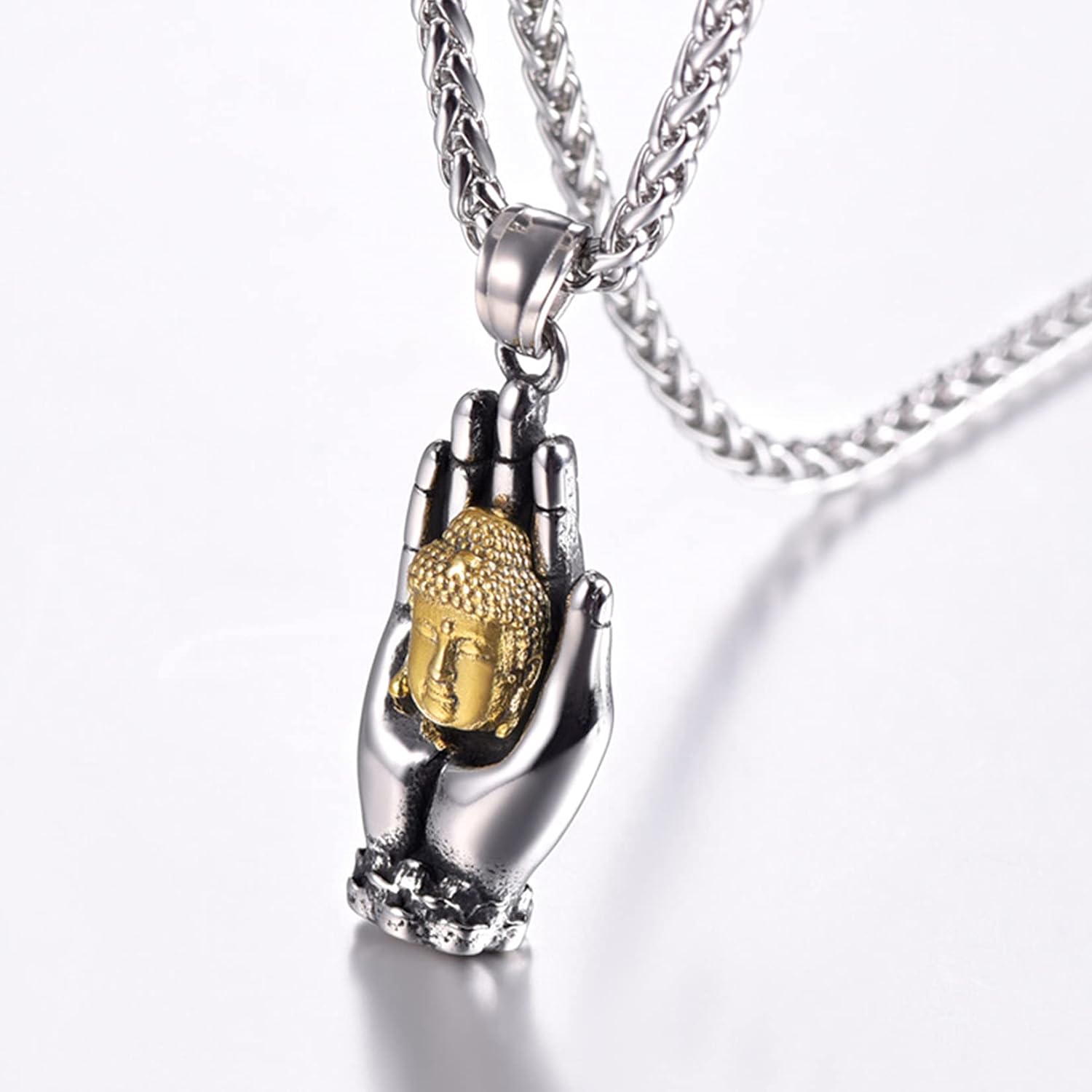 - Two-tone metal pendant: stainless steel praying hand and 18k gold plated buddha head.